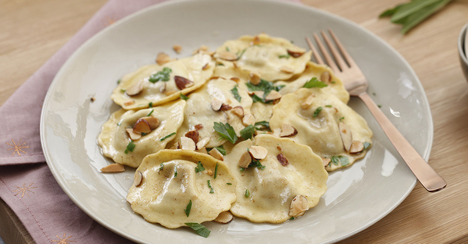 Zubereitungstipp: Butter in der Pfanne erhitzen und Mandelblättchen darin leicht rösten. Giovanni Rana „Ravioli Verde Artischocken“ zugeben und in der Mandelbutter schwenken.